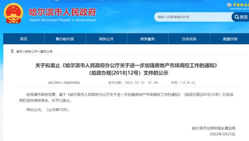 3月23日,《每日经济新闻》记者从哈尔滨市人民政府网站获悉,哈尔滨住房和城乡建设局(以下简称哈尔滨住建局)经报请市政府同意,鉴于《哈尔滨市人民政府办公厅关于进一步加强房地产市场调控工作的通知》(以下简称《调控通知》)已完成其阶段性调控使命,拟予以废止。其中就包括哈尔滨此前实行的主城区6区限售政策。