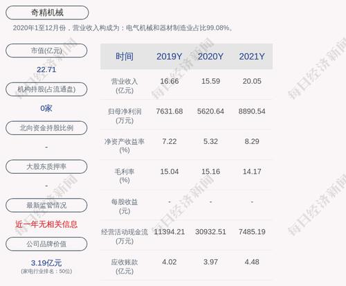 2020年1至12月份,奇精机械的营业收入构成为:电气机械和器材制造业占比99.08%。