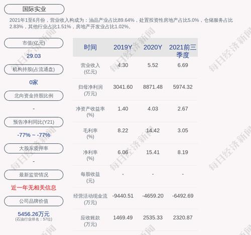 2021年1至6月份,国际实业的营业收入构成为:油品产业占比89.64%,处置投资性房地产占比5.0%,仓储服务占比2.83%,其他行业占比1.51%,房地产开发业占比1.02%。