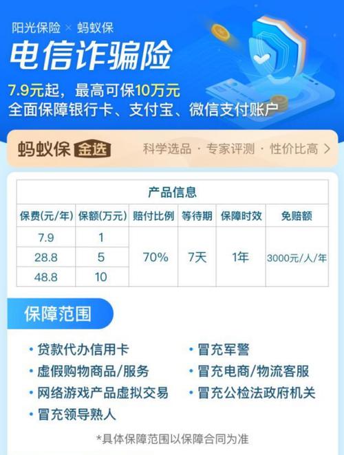 据了解,该产品保障期为1年,年免赔额3000元,投保后有7天的等待期,赔付比例为70%。用户在支付宝App内搜索“电信诈骗险”,就可进入蚂蚁保保险频道一键投保。