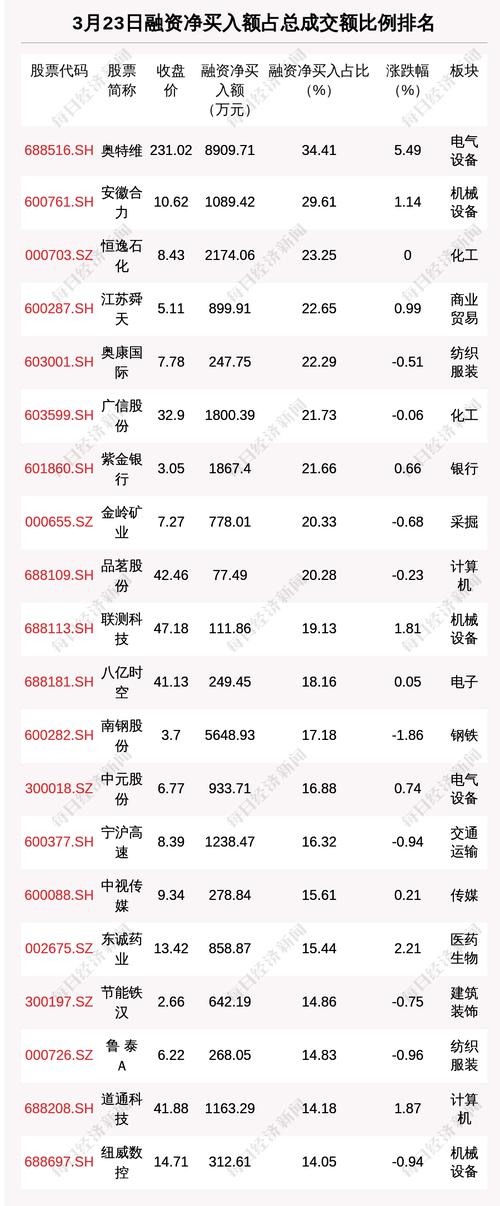 3月23日两市共有1103只个股有融资资金净买入。共有44只股票融资净买入额占总成交金额比例超10%,其中奥特维、安徽合力、恒逸石化排名前三,占比分别为34.41%、29.61%、23.25%。