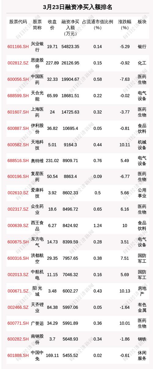 从融资资金净买入金额来看,共有6只个股净买入金额超亿元,其中兴业银行、恩捷股份、中国医药排名前三,买入金额分别为5.48亿元、2.61亿元、1.99亿元。