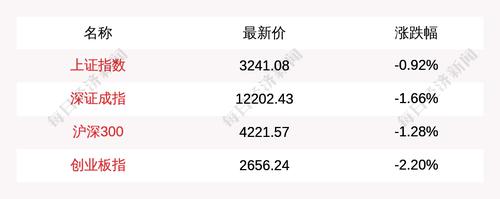 截至北京时间10:30,上证指数报3241.08点,跌0.92%,深证成指报12202.43点,跌1.66%,沪深300报4221.57点,跌1.28%,创业板指报2656.24点,跌2.20%