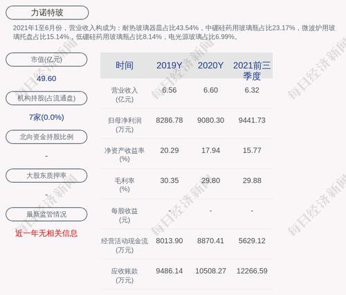 2021年1至6月份,力诺特玻的营业收入构成为:耐热玻璃器皿占比43.54%,中硼硅药用玻璃瓶占比23.17%,微波炉用玻璃托盘占比15.14%,低硼硅药用玻璃瓶占比8.14%,电光源玻璃占比6.99%。