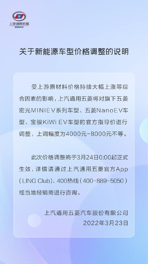 受上游原材料价格持续大幅上涨等综合因素的影响,上汽通用五菱将对旗下五菱宏光MINIEV系列车型、五菱NanoEV车型、宝骏KiWi EV车型的官方指导价进行调整,上调幅度为4000元-8000元不等。