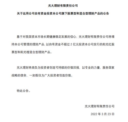3月23日晚间,光大理财发布《关于运用公司自有资金投资本公司旗下股票型和混合型理财产品的公告》。