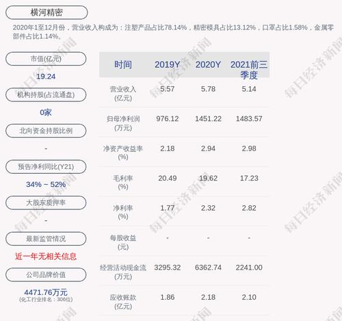2020年1至12月份,横河精密的营业收入构成为:注塑产品占比78.14%,精密模具占比13.12%,口罩占比1.58%,金属零部件占比1.14%。