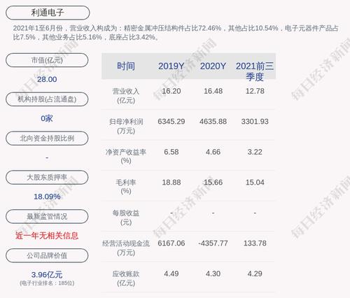 2021年1至6月份,利通电子的营业收入构成为:精密金属冲压结构件占比72.46%,其他占比10.54%,电子元器件产品占比7.5%,其他业务占比5.16%,底座占比3.42%。