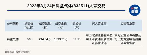 每经讯,2022年3月24日,新三板创新层公司科益气体(832511)发生一笔大宗交易,成交价6.5元/股,成交数量214.34万股,成交金额1393.21万元,溢价11.11%。买入营业部是申万宏源证券有限公司上海黄浦区新昌路证券营业部,卖出营业部是申万宏源证券有限公司上海黄浦区新昌路证券营业部。