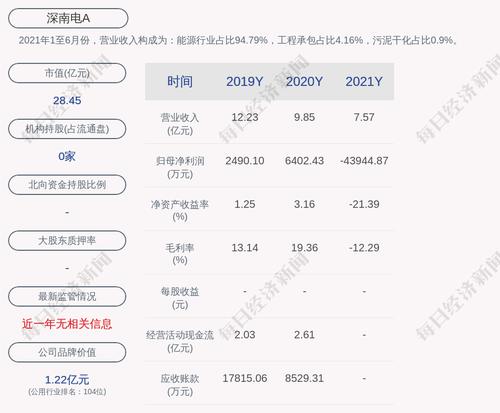 每经AI快讯,深南电A(SZ 000037,收盘价:6.77元)3月24日晚间发布年度业绩报告称,2021年营业收入约7.57亿元,同比减少23.15%;归属于上市公司股东的净利润亏损约4.39亿元;基本每股收益亏损0.7291元。分配方案为:不分红、不送红股、不转增。