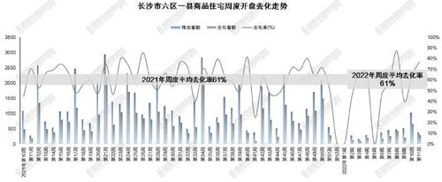 据湖南中原研究院数据,从3月份开始,长沙楼市的去化率有所回升,楼盘项目去化率整体维持在6-7成的水平,今年以来的周度平均去化率为61%,已经与2021年的周度平均去化率持平。
