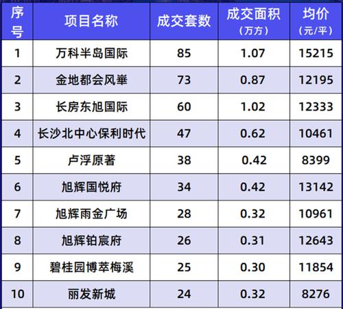 中原研究院统计的长沙上周成交量排在前10位的楼盘中,雨花区占了4个,天心区、开福区、岳麓区分别有2个楼盘上榜。其中成交均价最高的是万科半岛国际,全装修均价15215元/平方米;成交均价最低的是丽发新城,毛坯均价为8276元/平方米。
