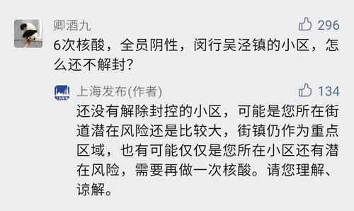 另据上海发布微信号3月24日消息,今天,有网友在上海发布微信号评论区询问:“6次核酸,全员阴性,闵行吴泾镇的小区,怎么还不解封?”