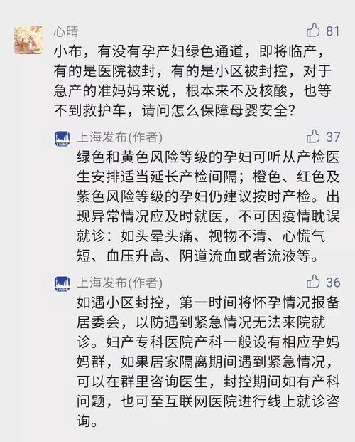 上海发布还表示:“如遇小区封控,第一时间将怀孕情况报备居委会,以防遇到紧急情况无法来院就诊。妇产专科医院产科一般设有相应孕妈妈群,如果居家隔离期间遇到紧急情况,可以在群里咨询医生,封控期间如有产科问题,也可至互联网医院进行线上就诊咨询。”