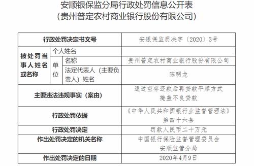处罚信息显示,贵州普定农村商业银行通过空存还款后再贷款平库方式掩盖不良贷款,安顺银保监分局依据《中华人民共和国银行业监督管理法》第四十六条规定,于2020年4月9日对该行作出罚款人民币二十万元的行政处罚决定。