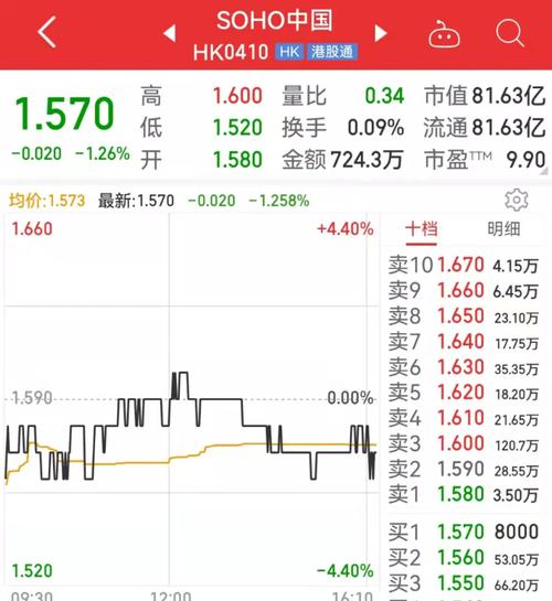 截止今日(24日)港股收盘,SOHO中国股价下跌1.26%,报1.57港元/股,总市值81.63亿港元。