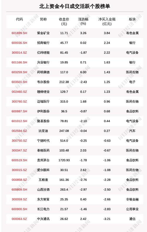 3月24日,北上资金成交活跃个股榜单中,净买入个股共11只,金额最多的是紫金矿业(601899.SH,收盘价:11.71元),净买入3.839亿元;净卖出个股共9只,金额最多的是中兴通讯(000063.SZ,收盘价:26.62元),净卖出3.214亿元。