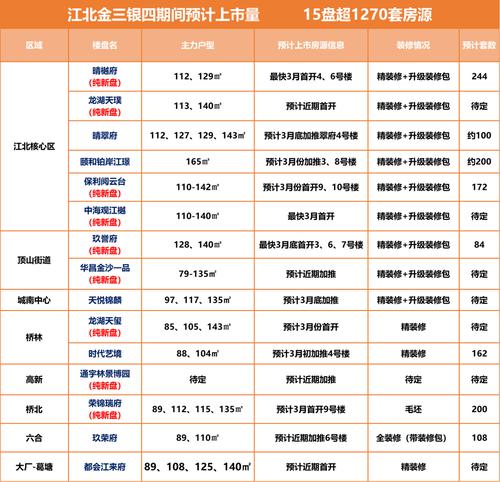 从张平提供的江北片区的加推房源情况来看,3-4月该片区累计有15个楼盘超过1270套房源入市,其中有5个已经售罄的楼盘预计在“金三银四”期间进行加推。