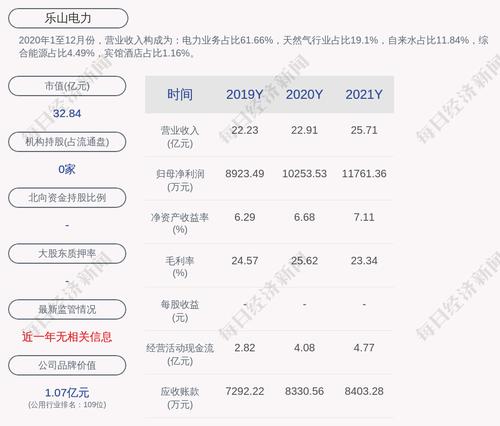 每经AI快讯,乐山电力(SH 600644,收盘价:6.1元)3月24日晚间发布年度业绩报告称,2021年营业收入约25.71亿元,同比增加12.22%;归属于上市公司股东的净利润盈利约1.18亿元,同比增加14.71%;基本每股收益盈利0.2184元,同比增加14.71%。分配方案为:公司不进行利润分配、公积金转增股本。