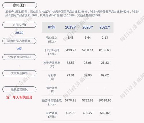 每经AI快讯,康拓医疗(SH 688314,收盘价:50.64元)3月24日晚间发布年度业绩报告称,2021年营业收入约2.13亿元,同比增加29.54%;归属于上市公司股东的净利润盈利约8163万元,同比增加55.83%;基本每股收益盈利1.57元,同比增加30.83%。分配方案为:每10股派发现金红利6.2元(含税)、不送红股、不转增。
