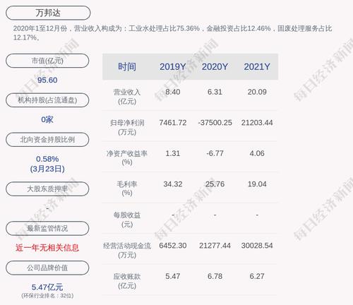 2020年1至12月份,万邦达的营业收入构成为:工业水处理占比75.36%,金融投资占比12.46%,固废处理服务占比12.17%。