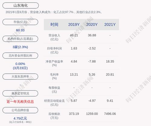 每经AI快讯,山东海化(SZ 000822,收盘价:6.74元)3月24日晚间发布年度业绩报告称,2021年营业收入约58.51亿元,同比增加58.66%;归属于上市公司股东的净利润盈利约6.05亿元;基本每股收益盈利0.68元。