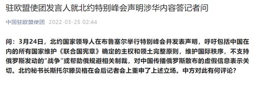 问:3月24日,北约国家领导人在布鲁塞尔举行特别峰会并发表声明,呼吁包括中国在内的所有国家维护《联合国宪章》确定的主权和领土完整原则,维护国际秩序,不支持俄罗斯发动的“战争”或帮助俄规避相关制裁,对中国传播俄罗斯散布的虚假信息表示关切。北约秘书长斯托尔滕贝格在会后记者会上重申了上述立场。中方对此有何评论?