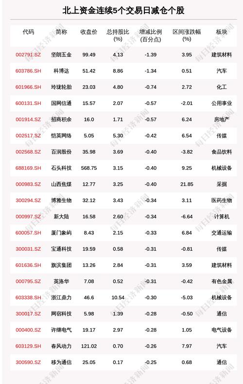 每经AI快讯,3月24日,北上资金连续5个交易日卖出71个股。北上资金连续5个交易日减仓个股中,坚朗五金(002791.SZ,收盘价:99.49元)减持比例增幅最大,5个交易日减持1.39百分点,其他跌幅较大的个股包括科博达(603786.SH,收盘价:51.42元)、玲珑轮胎(601966.SH,收盘价:23.03元)、国网信通(600131.SH,收盘价:15.57元),分别减持1.34个百分点、0.74个百分点、0.57个百分点。