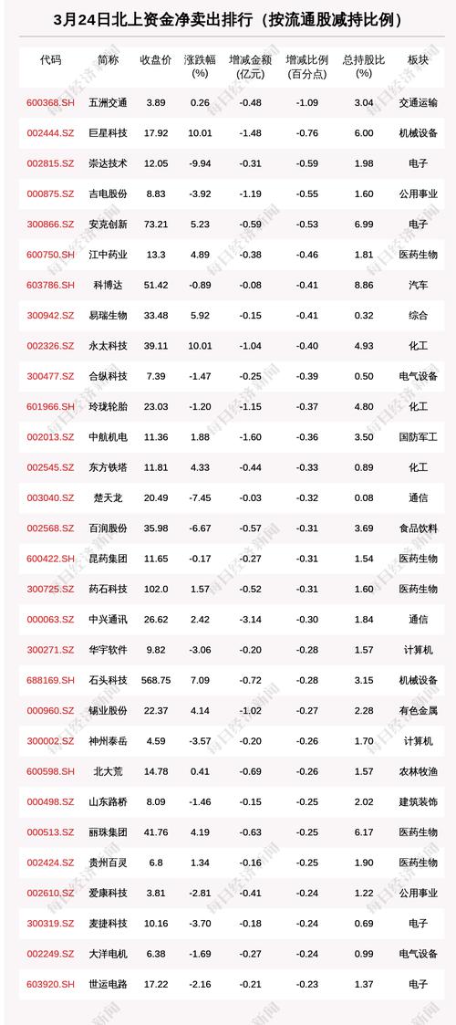 每经AI快讯,3月24日,北上资金净卖出的个股共有801只,北上资金减仓比例超1%的有677只。其中,五洲交通(600368.SH,收盘价:3.89元)减仓比例最为明显,最新持股比例3.04%,环比减少1.09个百分点。其他北上资金减仓比例较多的个股还包括巨星科技(002444.SZ,收盘价:17.92元)、崇达技术(002815.SZ,收盘价:12.05元)、吉电股份(000875.SZ,收盘价:8.83元)。