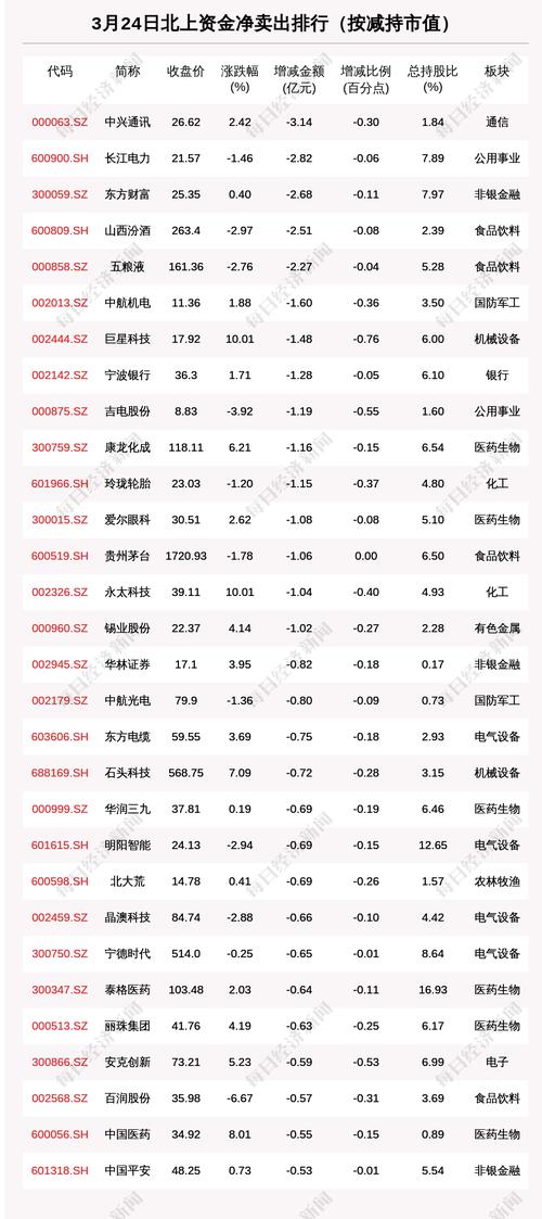 3月24日,按照北向资金减持市值排序,中兴通讯(000063.SZ,收盘价:26.62元)减持市值最大,减持市值3.141亿元,环比减少14.48%。其他北上资金减持市值较多的个股还包括长江电力(600900.SH,收盘价:21.57元)、东方财富(300059.SZ,收盘价:25.35元)、山西汾酒(600809.SH,收盘价:263.4元)。