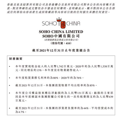 3月24日,SOHO中国披露2021年全年业绩数据。全年净利润由盈转亏, SOHO中国方面称,亏损主要是因为2021年确认集团附属公司发生的一次性税费开支约 4.39亿元。