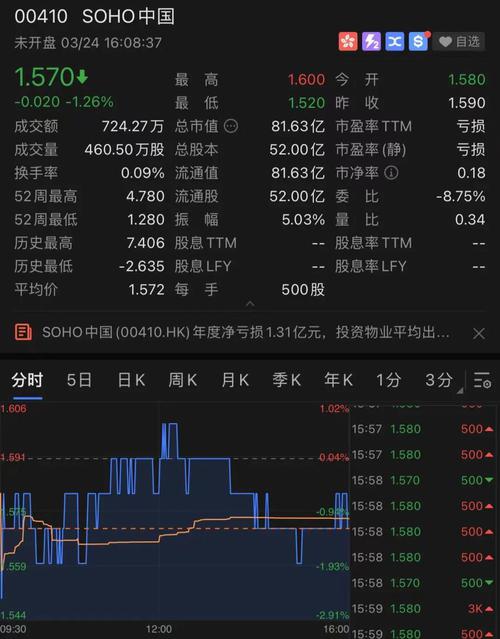 截至3月24日收盘,SOHO中国报1.57港元/股,跌幅1.26%,总市值81.63亿港元。