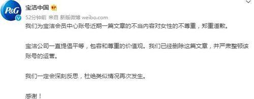 NO.6 3月24日,关键词“宝洁”冲上微博热搜榜,起因是此前宝洁会员中心公众号发布了一则标题为“女人脚臭是男人的5倍?不信现在闻一下”的文章。不少网友表示,看完文章后令人不适。 24日中午,宝洁中国微博发文称,为宝洁会员中心账号近期一篇文章的不当内容对女性的不尊重,郑重道歉。宝洁公司一直提倡平等,包容和尊重的价值观。 已经删除该篇文章,并严肃整顿该账号的运营。(每经综合)