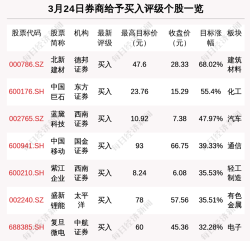 3丨整点投资丨3月24日68只个股获券商关注,北新建材目标涨幅达68.02%