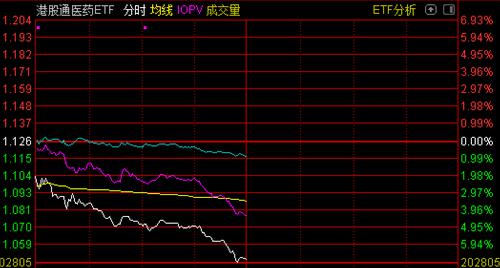 港股通医药ETF今日早盘低开低走,截至午间收盘下跌了6.84%,折价2.6%。