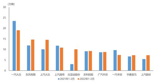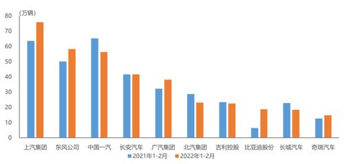 据中汽协统计分析,2022年1-2月,汽车销量排名前十位的企业(集团)共销售367.0万辆,占汽车销售总量的86.0%。在汽车销量排名前十位企业中,与上年同期相比,一汽、北汽、吉利和长城销量呈一定下降,其他企业均呈增长,比亚迪增速尤为显著。