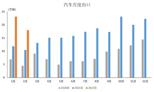 出口方面,中汽协指出,2022年2月汽车出口同比继续保持大幅增长。其中新能源汽车出口增长贡献度为52.0%。2022年2月,汽车出口18万辆,环比下降21.9%,同比增长60.8%。2022年1-2月,汽车出口41.2万辆,同比增长75.0%。