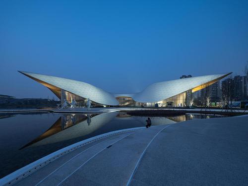 顺应岸线的变化,通过控制系统,调节光的明暗虚实变化,优美的曲线与建筑交相呼应。图源:成都市天府美术馆