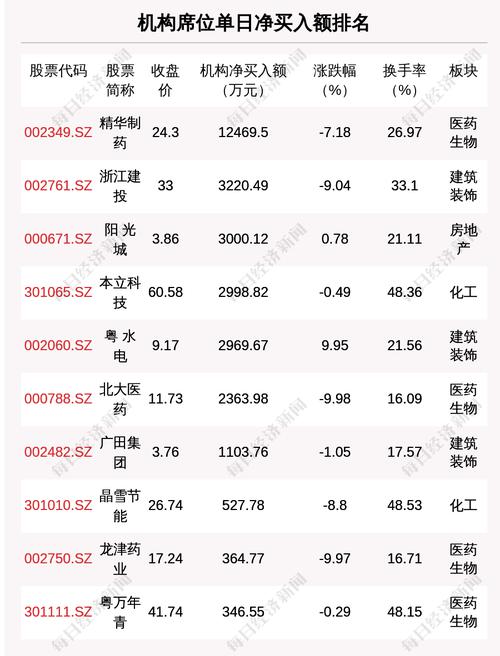 在龙虎榜中,涉及机构专用席位的个股有23只,净买入额前三的是精华制药、浙江建投、阳 光 城,分别为1.25亿元、3220.49万元、3000.12万元。