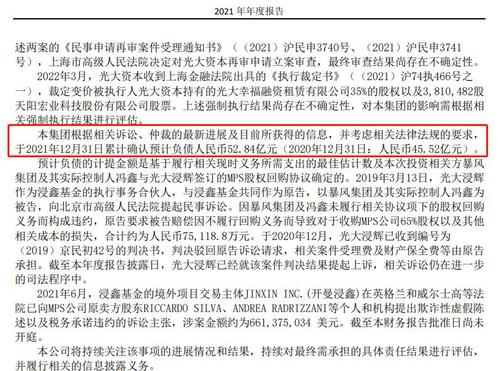 2016年5月,光大证券子公司光大资本与暴风集团牵头成立浸鑫基金,由该基金完成对英国体育版权公司MPS 65%股权的收购,交易价格约52亿元。但后续MPS破产,浸鑫基金未能按原计划实现退出,由于在浸鑫基金优先级有限合伙人出示的光大资本盖章的《差额补足函》中约定“在优先级合伙人不能实现退出时,由光大资本承担相应的差额补足义务”,光大资本暴露出巨额风险敞口。当前光大证券及其子公司相关银行账户和多项资产被司法冻结,年报亦因此连续多年计提巨额预计负债。