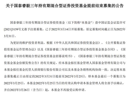 同时,原计划发行14个交易日的国泰睿毅三年持有A,宣布提前结束募集。公告显示,该基金于3月14日开始募集,原定募集时间截止日为3月31日。根据协商,基金募集截止日由原定的3月31日提前至3月25日,即该基金最后一个募集日为3月25日。
