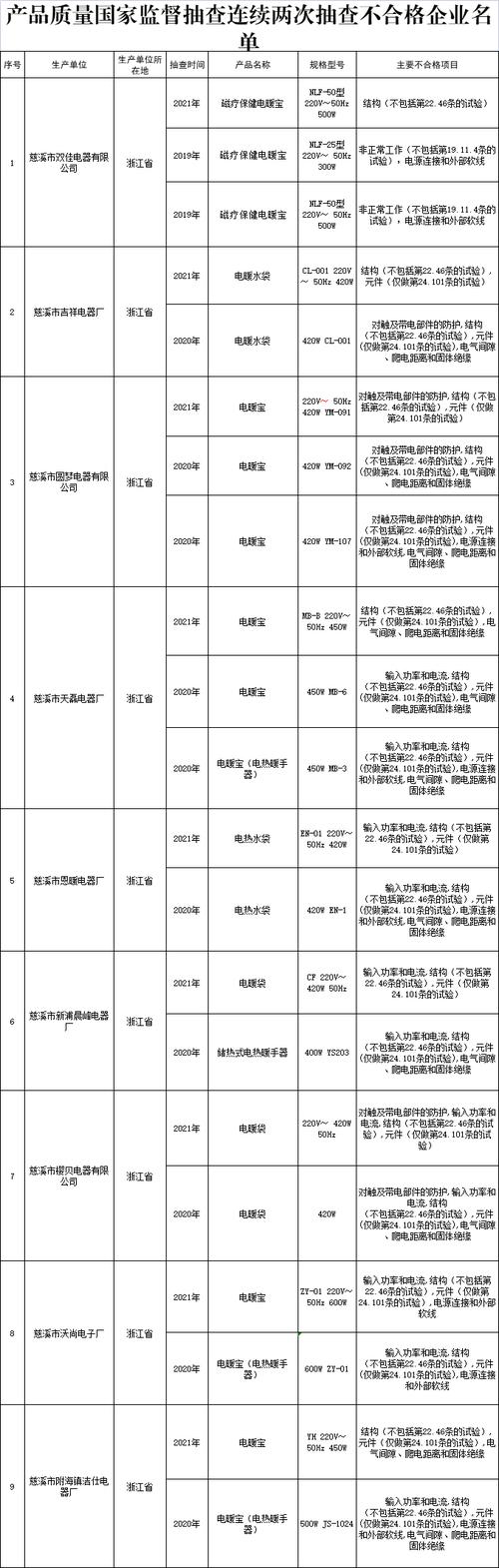 电热毯抽查不合格率为7.3%。本次抽查在流通领域开展抽样,抽查了14个省(市)96家企业生产的96批次产品,其中1批次产品涉嫌假冒,已交由企业所在地市场监管部门处理。在检验的96家企业生产的96批次产品中,发现7批次产品不合格,抽查不合格率为7.3%,较上次抽查下降26个百分点。