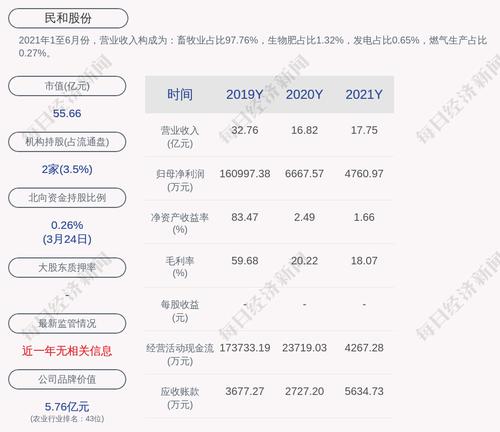 每经AI快讯,民和股份(SZ 002234,收盘价:15.95元)3月25日晚间发布年度业绩报告称,2021年营业收入约17.75亿元,同比增加5.56%;归属于上市公司股东的净利润约4761万元,同比减少28.6%;基本每股收益0.14元,同比减少36.36%。分配方案为:不分红、不送红股、不转增。