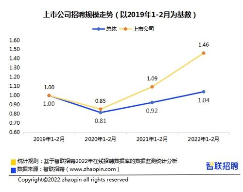 从招聘规模来看,智联招聘监测2019年以来上市公司招聘规模变化,并与全平台总体趋势对比。疫情爆发的2020年初,两者招聘规模均同比下降20%左右。2021年1-2月,上市公司招聘规模已恢复至疫情前水平,并超出2019年同期9%。此时总体招聘规模依然比2019年同期低8%。2022年1-2月,上市公司招聘规模已超出2019年同期46%,增幅进一步扩大,且远领先于4%的总体招聘规模增幅。