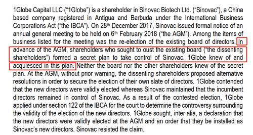 根据前述SEC文件,截至2017年12月,李嘉强和1Globe持有科兴生物普通股股份占比约31%,而《每日经济新闻》记者得到的一份安提瓜和巴布达东加勒比最高法院的裁判文书显示,在2018年2月科兴生物的股东大会之前,试图罢免现有董事会的股东(持不同意见的股东)制定了一项控制科兴的“秘密计划”,而1Globe则默许了这项改选科兴生物董事会的计划。