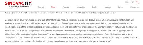 科兴董事长、总裁兼CEO尹卫东表示,“我们对今天的判决深感欣慰,判决确保了有效权利的持股人获得他们应得的经济价值。我们呼吁强新资本接受其对SINOVAC科兴及其股东的行动后果,尊重多项对其的独立调查结果,并终止对SINOVAC科兴的行动。我们并没有被这场诉讼分散注意力,公司运营持续稳定发展。”