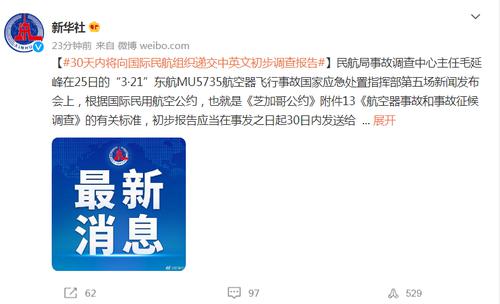 据新华社微博3月25日报道,民航局事故调查中心主任毛延峰在25日的“3·21”东航MU5735航空器飞行事故国家应急处置指挥部第五场新闻发布会上表示,根据国际民用航空公约,也就是《芝加哥公约》附件13《航空器事故和事故征候调查》的有关标准,初步报告应当在事发之日起30日内发送给有关国家和国际民航组织,应以国际民航组织工作语言发送,中文/英文都是ICAO(国际民用航空组织)的工作语言。