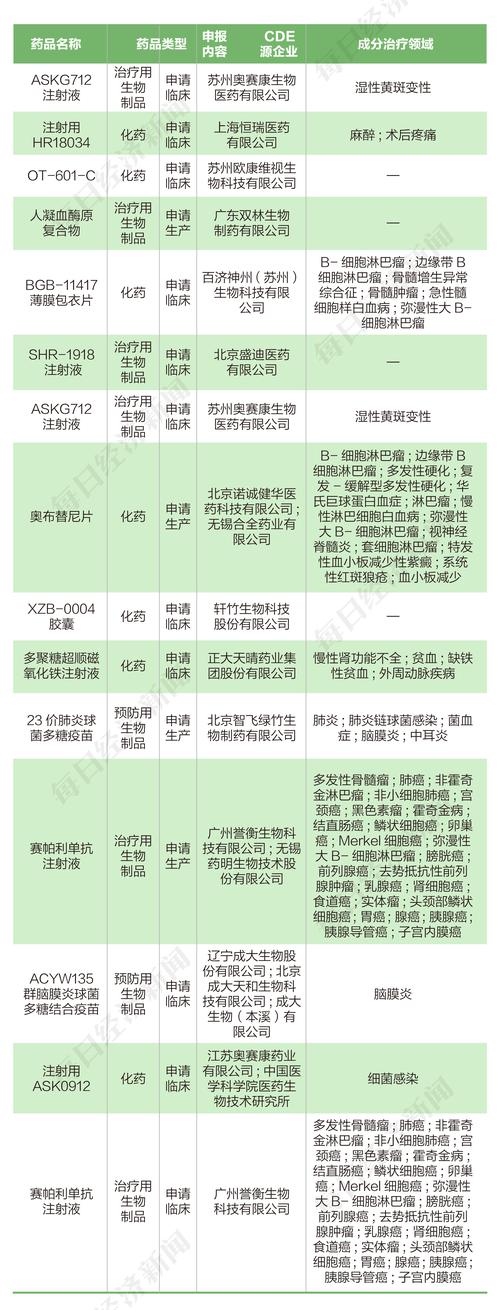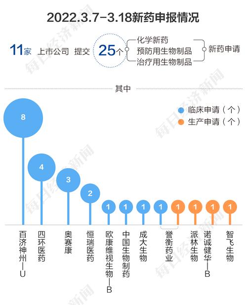 2022年3月7日至3月18日期间,百济神州-U(688235.SH)申报8个临床申请,四环医药(00460.HK)申报4个临床申请,奥赛康(002755.SZ)申报3个临床申请,恒瑞医药(600276.SH)申报2个临床申请,欧康维视生物-B(01477.HK)、中国生物制药(01177.HK)、成大生物(688739.SH)各申报1个临床申请。派林生物(000403.SZ)、诺诚健华-B(09969.HK)、智飞生物(300122.SZ)各申报1个生产申请。誉衡药业(002437.SZ)共申报1个临床申请和1个生产申请。