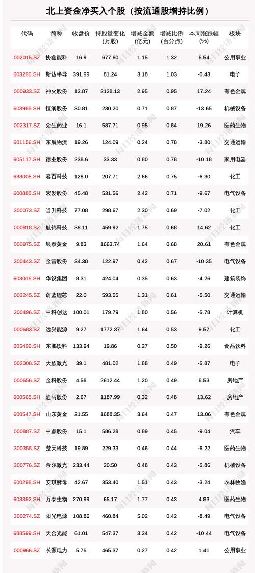 本周北上资金净买入个股共有534只,北上资金加仓比例超1%的有480只。其中,协鑫能科(002015.SZ,收盘价:16.9元)加仓比例最为明显,最新持股比例2.78%,环比增加1.59个百分点。其他北上资金加仓比例较多的个股还包括斯达半导(603290.SH,收盘价:391.99元)、神火股份(000933.SZ,收盘价:13.87元)、恒润股份(603985.SH,收盘价:30.81元)。