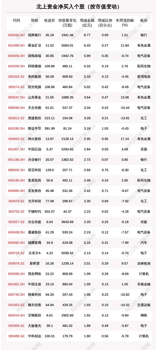 按照北向资金增持市值排序,招商银行(600036.SH,收盘价:45.18元)增持市值最大,增持市值8.772亿元,环比增加1.13%。其他北上资金增持市值较多的个股还包括紫金矿业(601899.SH,收盘价:11.52元)、国电南瑞(600406.SH,收盘价:30.85元)、药明康德(603259.SH,收盘价:109.86元)。